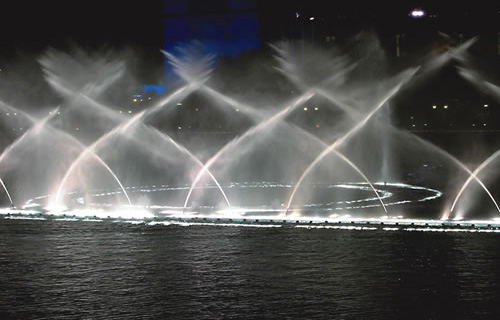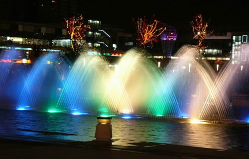 音乐喷泉:利用播放或现场演奏音乐信号控制喷泉和灯光的喷泉。根据专用的音乐喷泉控制系统使喷水造型变化和灯光的变化随音乐的节奏、旋律的起伏变化而变化,美妙绝伦,同步率可达到±0.02秒,既可以为实时控制,编辑控制,又可以为电脑智能控制。用户可以在编辑界面编写自己喜爱的音乐程序。播放系统可以实现音乐、水、灯光气氛统一,同步播放。