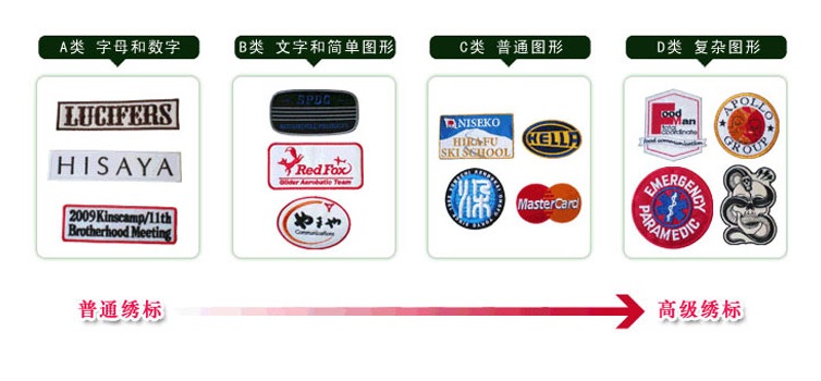 绣标的报价很重要的一个因素是图案的复杂程度(图形的复杂、颜色多寡)及对工艺的要求,可以按从见到到复杂分为以下四类:
