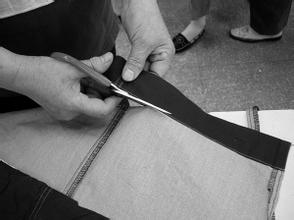 此外,应尽可能地使用细针。因细针能明显减少在穿过职业装面料时所产生的阻力,故有防止缝缩起皱的效果,同时要注意经常更换新针。当使用合成缝纫线时,必须小心确定缝线的张力,应使张力调整到最低。底线张力必须调整到:当缝线自由移动的末端拉起时,底线梭心轴及外套慢慢向下滑动,面线与底线的张力必须保持一致,使它们恰好在两层职业装面料之间交织。